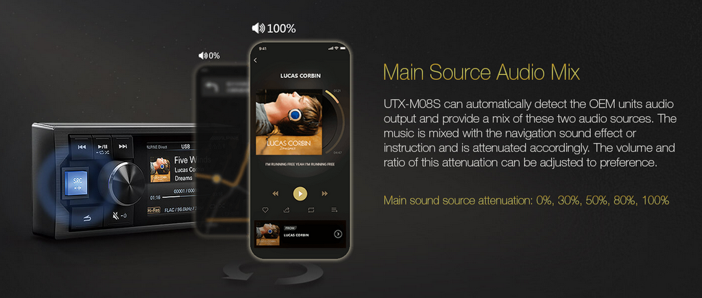 Vehicles equipped with a factory navigation system and integrated vehicle controls often cannot be changed. The UTX-M08S keeps your OEM system intact by allowing it to be integrated with the OEM system for pure high-end sound and additional functions such as Bluetooth (4.0) for audio and music streaming. Plus, the auxiliary input with ‘nav mix’ lets you hear voice guidance from the factory navigation system.