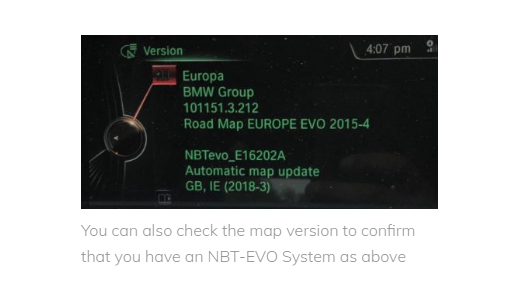 EVO iDrive is available in 3 versions, iD4, iD5 and iD6. The easiest way of determining which version you have is by looking at the menu screen