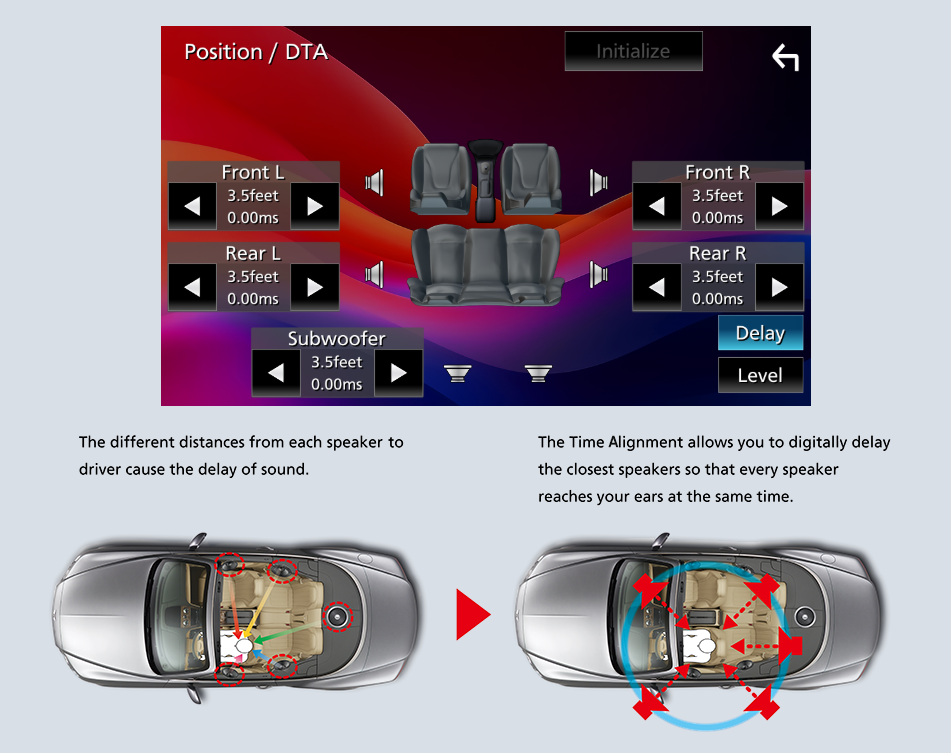 By selecting the speaker type and the distance to the center of the listening position, the receiver will automatically adjust the timing of the sound output from each of the speakers so that the sound from each of the speakers will arrive exactly at the same time to the listening position.