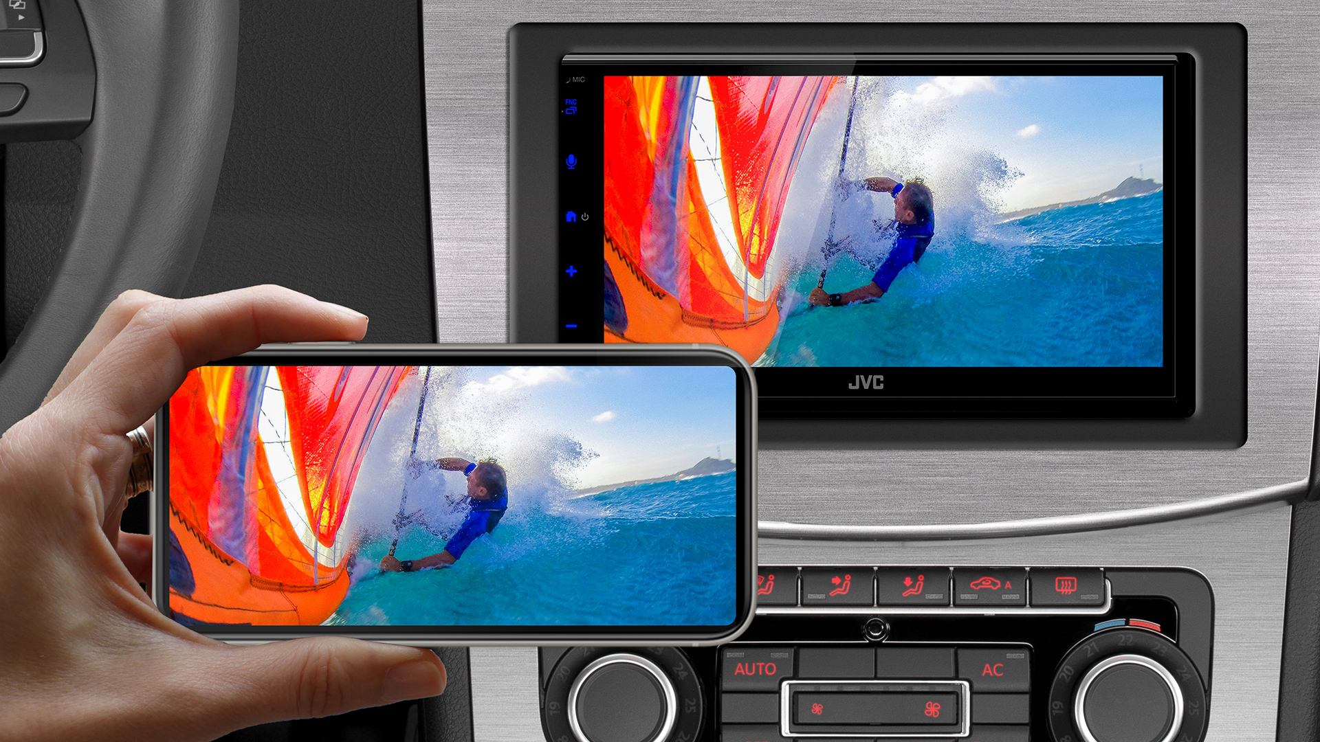 By installing the “MirrorApp+” app, your mobile phone is seamlessly displayed on the receiver's screen without cable. You can enjoy a variety of apps such as Waze, YouTube™, and Instagram. Touch control is possible from both screen and mobile phone.