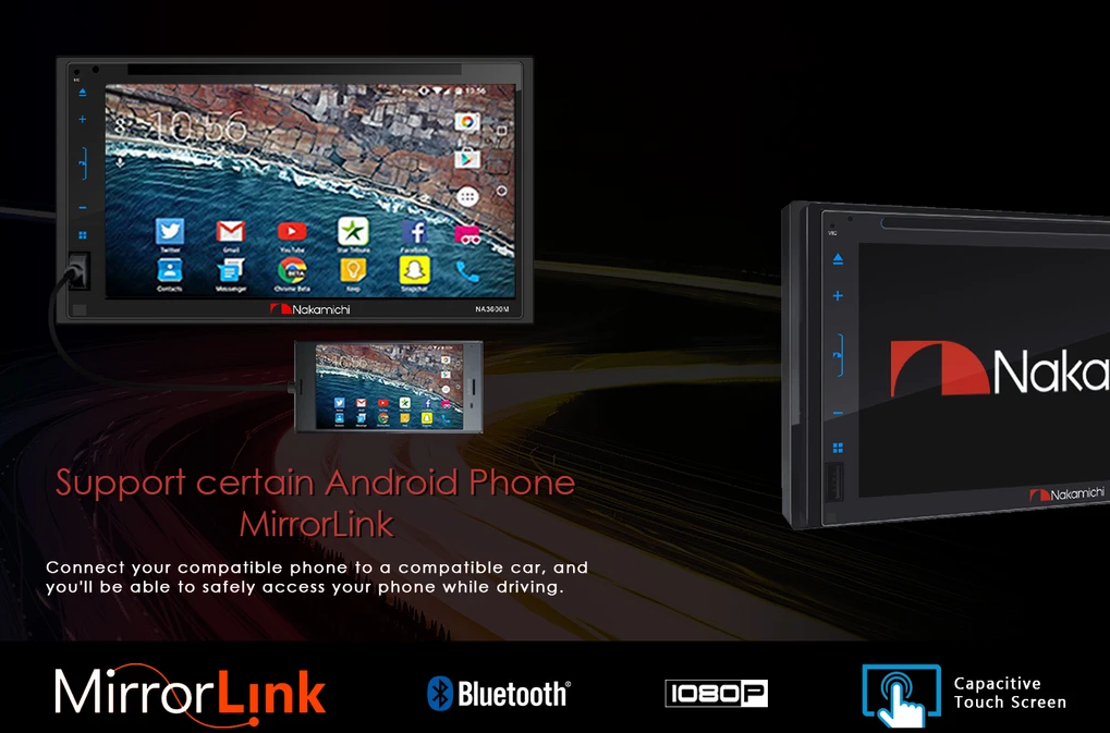 Nakamichi NA3600M, our DVD 2 DIN receiver with build in Android mirrorlink for ease of access with your mobile phone and is compatible with a wide array of CD and DVD formats such as DVD/VCD/MP3/MP4/CD-R/CD-RW/DIVX.