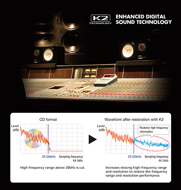 K2 is a JVC original technology that reproduces the original master sound by expanding the frequency range. For example, K2 will expand the digital data of the audio CD recorded at 44.1kHz to 192 kHz. It is also possible to recreate the high-frequency range above 20kHz that is cut during the CD formatting.