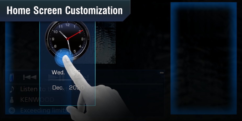 The 10.1" home screen is composed of a Driving Widget as well as a Source Control Widget overlaid on the background. You can move the Driving Widget from side to side or enlarge the Source Control Widget to optimize the screen for your intuitive operation. The Driving Widget allows selection of a clock, compass, or equalizer setting, etc., while the background allows selection of album art, audio visualizer, or photo.