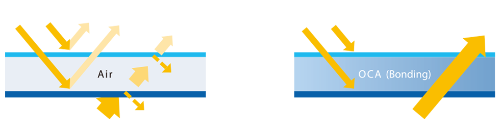 Optical Clear Adhesive (OCA) is added between the touch screen and the LCD to eliminate the air layer and suppress light reflection and glare. This feature enhances the contrast and brightness and maintains the visibility of the display in various environments.