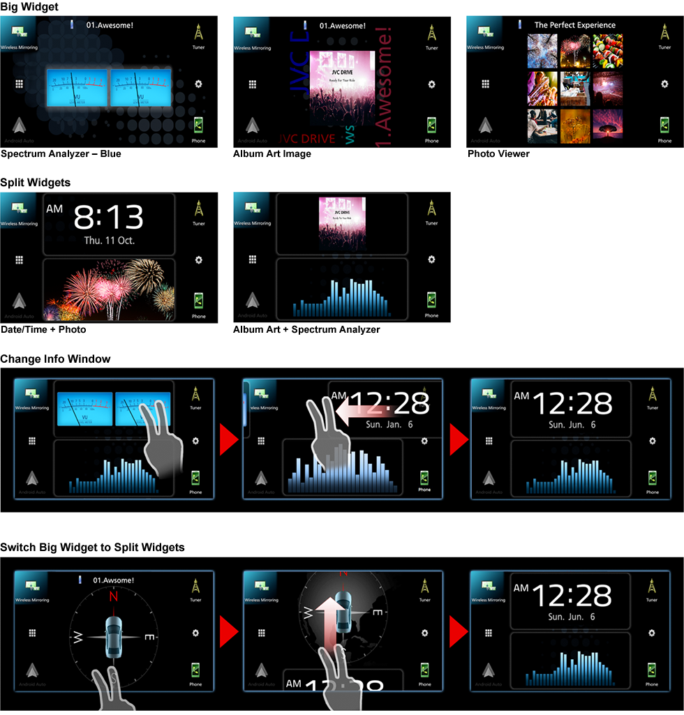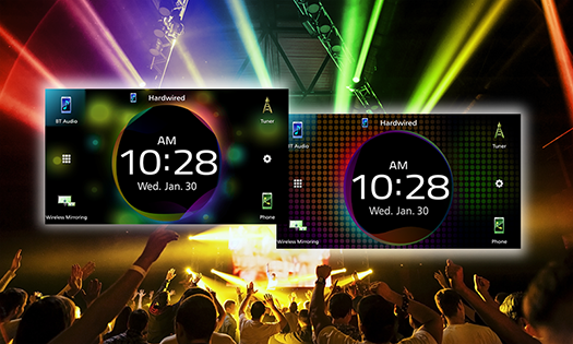 Various information including time, photos, album art images, or iDatalink Maestro and more, can be displayed on the home screen in a big, easy-to-view way. Swiping the monitor with two fingers lets you split the screen or change the information window.