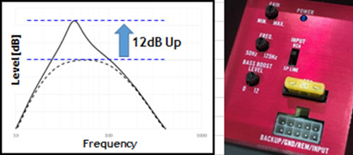 With the adoption of the high power class D amplifier, it can feel an amazing volume of bass sound. Bass boost circuit is installed. The user can adjust the bass level to their preference. By optimizing the amplifier, the speaker unit, and the enclosure, it achieves a bass sound with an overwhelming volume.
