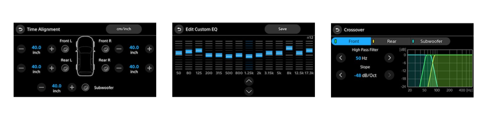 The built-in DSP offers sound processing and time alignment - down to a remarkable 1cm for each of the 5 addressable channels (4 speakers + subwoofer via pre-out). A 14-band EQ lets you adjust the overall sound to your music or taste. Together with the 3-zone crossover, you can dial in the perfect match of front, rear and subwoofers.