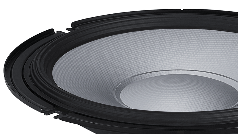 Not only does Alpine’s patented High Amplitude Multi-Roll (HAMR) surround maintain full control over the cone at any stage of excursion for high SPL. It’s ability to far exceed the maximum linear excursion of regular domed surround allows for beautifully pure sound and punchy bass.